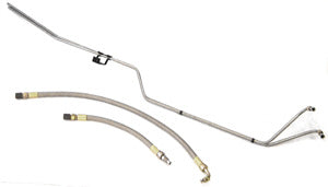 This new product, developed by Bowtie Overdrives, makes the miserable job of making a custom set of transmission cooling lines a simple matter involving ordinary hand tools. Our new lines can be installed in a matter of minutes without lifting the engine or removing accessories. This system consists of custom bent 5/16" hard lines designed individually for Powerglides, Th-350, Th-400, 4L80E, 4L60E, Th-700R4 and Th-2004R Transmissions. The hard line sections route around the starter, along the engines pan rail and terminate just in front of the engines harmonic balancer. The custom, stainless steel, braided, flexible lines run from the radiator outlets down to these hard lines. The hard lines are cut to the correct length using a simple tubing cutter. Final connections are made using our special slip on fittings then tightened up using hand wrenches. Comes complete with lines, clamps and brackets to hold the lines are NO longer available.