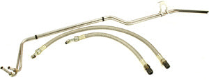 This new product, developed by Bowtie Overdrives, makes the miserable job of making a custom set of transmission cooling lines a simple matter, involving ordinary hand tools. Our new lines can be installed in a matter of minutes without lifting the engine or removing accessories. This system consists of custom bent 5/16" hard lines, designed individually for Powerglides, Th-350, Th-400, 4L80E, 4L60E, Th-700R4 and Th-2004R Transmissions. The hard line sections route around the starter, along the engines pan rail and terminate just in front of the engines harmonic balancer. The custom, stainless steel, braided, flexible lines run from the radiator outlets down to these hard lines. The hard lines are cut to the correct length using a simple tubing cutter. Final connections are made using our special slip-on fittings then tightened up, using hand wrenches. Comes complete with lines, clamps and brackets to hold the lines are NO longer available.