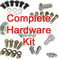 Complete Hardware kit icludes the following: Flex Plates bolts (all Chevrolet Motors), (6) 3/8-16 x 1 1/2 nuts and washers bellhousing bolts , (4) #14 sheet metal screws for inspection cover, (2) 10.5 x 1 1/2mm mount-to-trans case bolts, (1) 10.5 mm nut for manual shaft shifter, and (2) 7/16 x 14 bolts trans mount-to-x-member with washers.