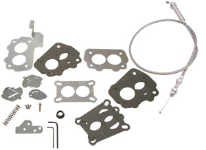Our adjustable U.S. patent pending system is the most precise way to properly set up the extremely critical relationship between the throttle valve system in the transmission and carburetor. This system is very simple to install. It uses an under the carburetor base plate for mounting the standard cable and a three piece adapter that indexes over the Rochester 2 Barrel linkage, that has been precisely engineered to pull it's required distance. This system will not only set up your throttle valve system properly but it's easily adjustable so you can quickly change the light throttle/medium throttle shift characteristics. You can manipulate the shift characteristics with this system simply by rotating the cam assembly to any position. This system is for Pontiac units only. The measurement for the small base is 3 1/4" on the center carburetor from side to side across the studs. The measurement on the front and back carburetors is 3 3/4" across the carburetor studs from side to side. This kit is available with a braided stainless steel TV cable only. Optional throttle cable bracket available for $15.00. This bracket is not included with the kit it must be ordered separately. For more information, click here