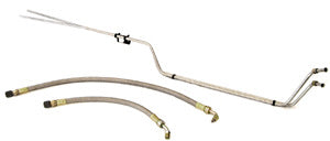 This new product, developed by Bowtie Overdrives, makes the miserable job of making a custom set of transmission cooling lines a simple matter involving ordinary hand tools. Our new lines can be installed in a matter of minutes without lifting the engine or removing accessories. This system consists of custom bent 5/16" hard lines designed individually for Powerglides, Th-350, Th-400, 4L80E, 4L60E, Th-700R4 and Th-2004R Transmissions. The hard line sections route around the starter, along the engines pan rail and terminate just in front of the engines harmonic balancer. The custom stainless steel braided flexible lines run from the radiator outlets down to these hard lines. The hard lines are cut to the correct length using a simple tubing cutter. Final connections are made using our special slip-on fittings then tightened up using hand wrenches. Comes complete with lines, clamps and brackets to hold the lines are NO longer available.
